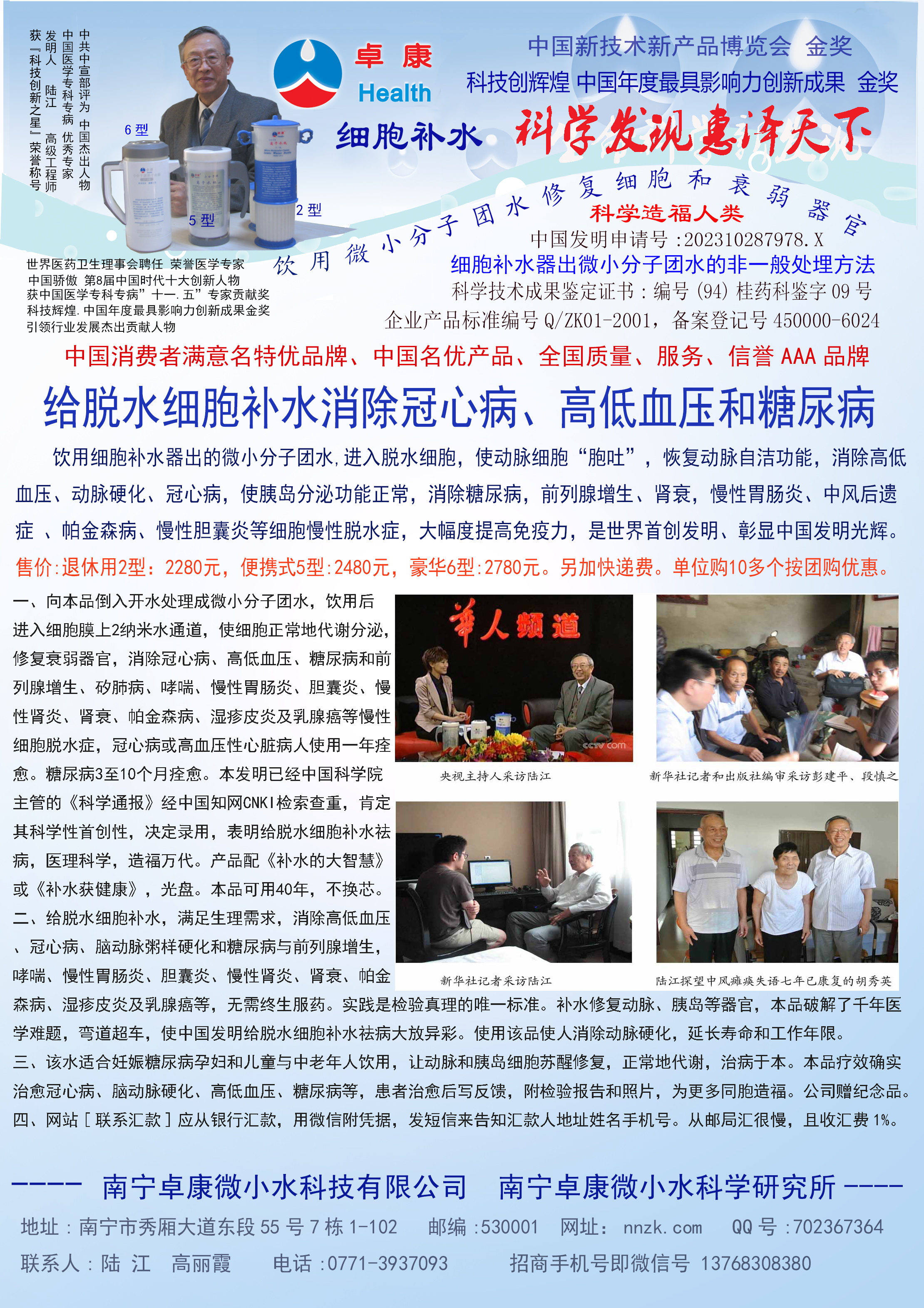 人類幾千年來患以上病癥需終生服藥,幾十年也不能治愈??墒俏覈蠈幍母呒?jí)工程師陸 江,于1990年想根治高血壓,研究發(fā)明了離子水瓶,處理出微小分子團(tuán)水供飲用,經(jīng)過醫(yī)院臨床試用和專家鑒定,1999年獲中國發(fā)明專利權(quán),產(chǎn)品于2000年投放市場(chǎng)后一直跟蹤調(diào)查,據(jù)全國各地用戶反饋:祛除了高低血壓、糖尿病和冠心病,并使前列腺增生、咽喉炎、鼻竇炎、慢性氣管炎、支氣管炎、矽肺病、哮喘、慢性胃炎、腸炎、慢性膽囊炎、慢性腎炎、腎衰、膀胱炎、便秘、痔瘡、風(fēng)濕性關(guān)節(jié)炎和濕疹皮炎及中風(fēng)后遺癥等病癥不藥而愈。為什么喝微小水能治20多種病?陸 江從1991年德國科學(xué)家發(fā)現(xiàn)細(xì)胞膜水通道僅為2納米獲得啟發(fā),認(rèn)為多種器官患病是因細(xì)胞脫水,不能正常代謝和分裂增殖,才使器官細(xì)胞減少致衰弱萎縮而形成細(xì)胞缺水性病癥。22年來的實(shí)踐有力地支持了“細(xì)胞脫水致病”這一重要論點(diǎn),表明喝微小水可滿足細(xì)胞的生理需求,補(bǔ)水就能祛病,是生命科學(xué)新亮點(diǎn)。